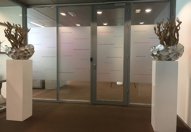 De ramen naar de beveiligde ruimte bij Schiphol Telematics hebben we voorzien van glasstaal effect folie. Deze folie is voorzien van full color print.